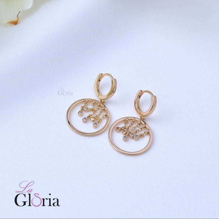 حلق ذهبي أنيق بتصميم دائري مفتوح يعانق الأذن بخطوط متناسقة، مزين بأربعة تعليقات صغيرة متدلية على شكل قطرات مزودة بأحجار شفافة تضفي بريقاً فاخرًا وأسلوباً راقياً. التصميم المتدلي يضيف لمسة حيوية وحركة أنثوية مميزة. مطلي بالذهب عيار 18 مكفول سنة لتغير اللون.