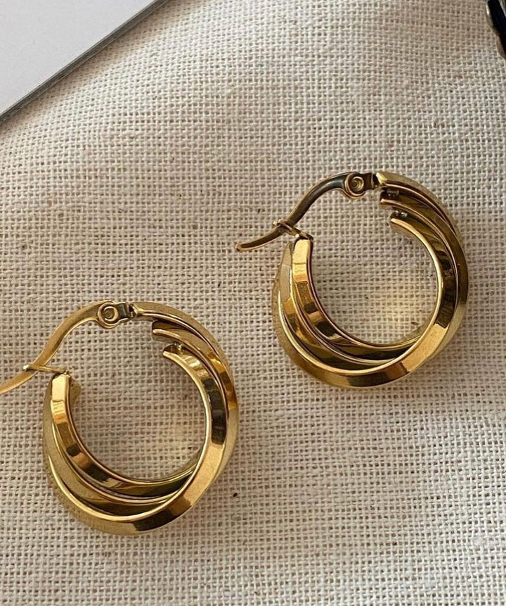 حلق ذهبي دائري أنيق بتصميم متعدد الطبقات يضيف بعداً مميزاً لمظهر الأذن. الحلق متوسط الحجم بسطح لامع يعكس الضوء بشكل ناعم ويضفي لمسة كلاسيكية راقية على أي إطلالة. مطلي بالذهب عيار 18 مكفول سنة لتغير اللون.