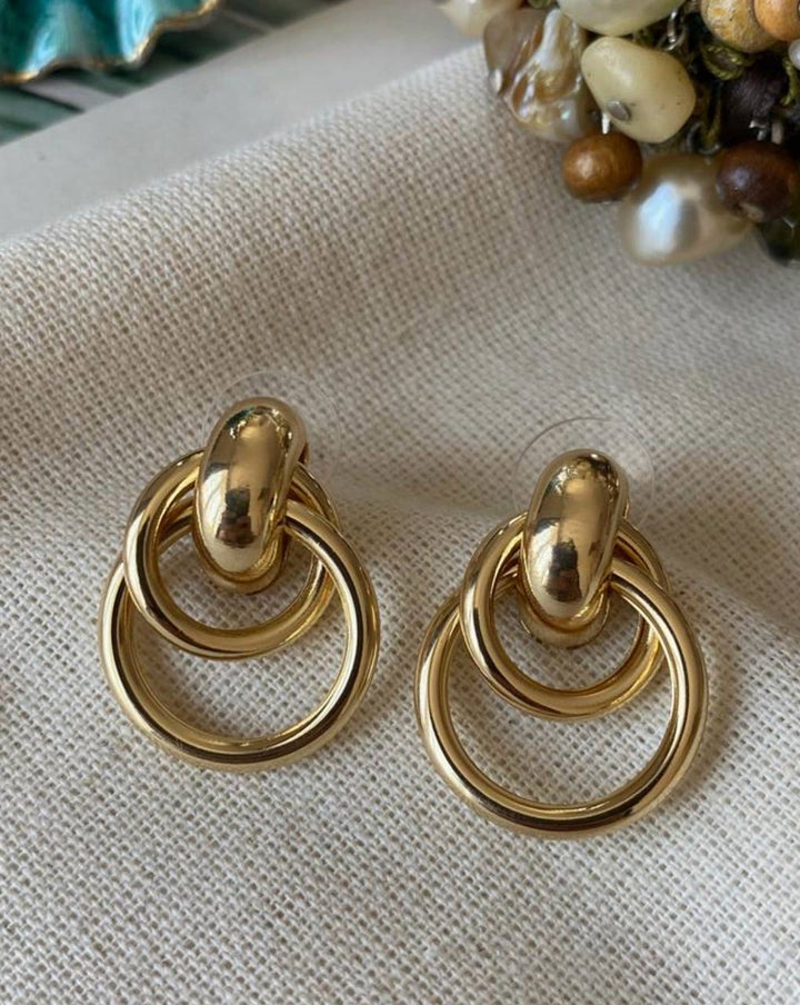 حلق أنيق مصنوع من المعدن المطلي بالذهب، يتميز بتصميم دائرتين متداخلتين يضفي مظهراً عصرياً وفاخراً.