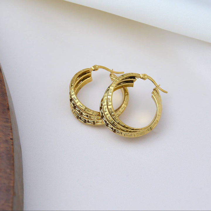 حلق دائري مطلي بالذهب مع نقوش هندسية دقيقة تضيف لمسة أنيقة وعصرية للمظهر.