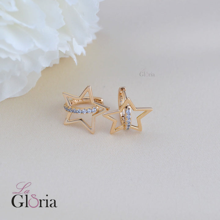 حلق دائري ذهبي اللون بتصميم نجمة مفتوحة أنيقة، مزين بشريط مركزي مرصع بأحجار كريستال شفافة تضفي لمسة براقة وعصرية. تصميم صغير الحجم يناسب الإطلالات اليومية والمناسبات الخاصة. مطلي بالذهب عيار 18 مكفول سنة لتغير اللون.