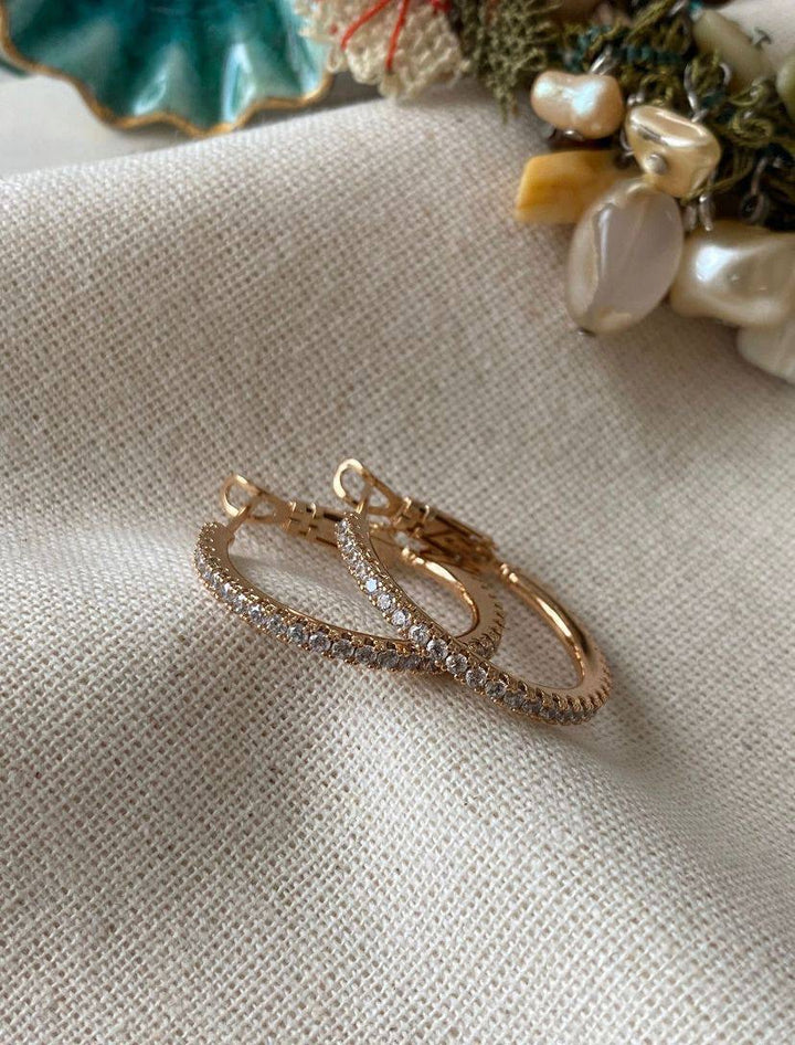 حلق هوب ذهبي أنيق مرصع بأحجار لامعة تضيف لمسة فخمة وبراقة للمظهر.
