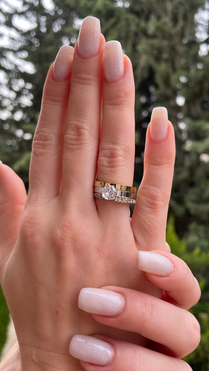 خاتم بتصميم ثلاثي مميز يتكون من ثلاث قطع متلاصقة بألوان متنوعة بين الذهبي والفضي، مع حجر ألماس كبير مركزي يضفي لمسة فخامة ورقي. القطعة العليا تحمل نُقوشًا صغيرة وفصوصًا لامعة تزيد من بريق الخاتم، بينما القطعتان السفليتان مزينتان بفصوص أصغر بشكل متناسق تبرز جمال التصميم. الخاتم يأتي بعرض متوسط يليق بالظهور الأنيق واليومي. مطلي بالذهب عيار 18 مكفول سنة لتغير اللون.