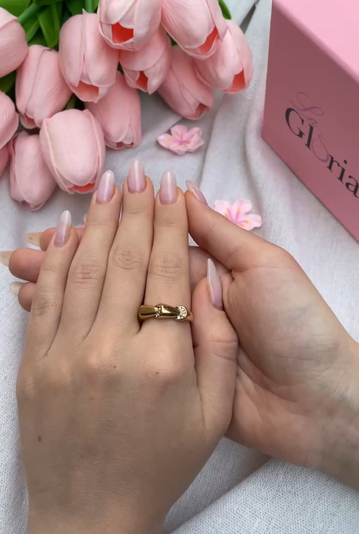 خاتم بتصميم فريد مستوحى من شكل البامبو يبرز بأناقته البسيطة والمتجددة، يتميز بلونه الذهبي اللامع الذي يغطى سطح الخاتم بشكل متقن. الخاتم عريض من جانب واحد مع تفصيلة تبدو كأنها عقدة أو تقاطع، تزينه مجموعة صغيرة من الفصوص اللامعة التي تضفي بريقاً راقياً ومميزاً على التصميم. مزيج بين الأناقة والطبيعة بأسلوب عصري جذاب. مطلي بالذهب عيار 18 مكفول سنة لتغير اللون.