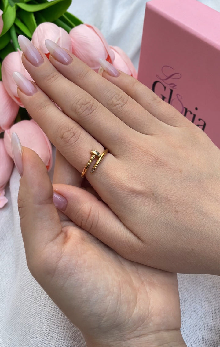 خاتم بتصميم عصري وأنيق يحاكي شكل المسمار الملفوف حول الإصبع، باللون الذهبي اللامع. يتميز الخاتم بشريط رفيع ينتهي برأس المسمار المرصع بفصوص صغيرة براقة تضيف لمسة من التميز والرقي. تصميمه المفتوح يجعله قطعة فريدة تناسب جميع المناسبات. مطلي بالذهب عيار 18 مكفول سنة لتغير اللون.