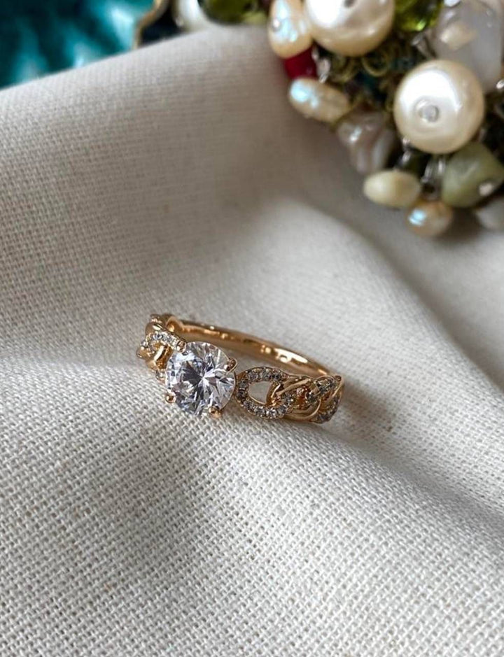 خاتم بتصميم فاخر يجمع بين الأناقة والتميز، مصنوع من الذهب الوردي الذي يضفي لمسة دافئة ورومانسية. يتميز الخاتم بحلقة متوسطة السُمك على شكل حلقات متشابكة مزينة بفصوص صغيرة براقة تضفي عليه بريقاً خاصاً. يتوسط التصميم حجر كريم دائري كبير يلتقط الأنظار بلمعانه الفائق، مما يجعل الخاتم مثالياً للإطلالات الحصرية والمميزة. مطلي بالذهب عيار 18 مكفول سنة لتغير اللون.