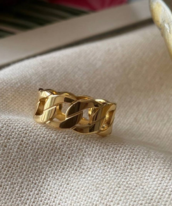 خاتم بتصميم مبتكر مكون من حلقات ذهبية مترابطة بشكل متماسك يضفي عليه مظهراً أنيقاً وعصرياً. يتميز بسطح لامع يعكس الضوء ليبرز بريقه الفخم، مع عرض متوسط يضمن الراحة والتميز عند الارتداء. مصنوع باللون الذهبي الدافئ الذي يضفي لمسة كلاسيكية عصرية في آن واحد. مثالي لمن يبحث عن تصميم بسيط لكنه ملفت للنظر. مطلي بالذهب عيار 18 مكفول سنة لتغير اللون.