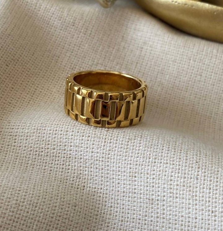 خاتم ذهبي عريض بتصميم مستوحى من حلقات السلاسل المتشابكة، حيث يأتي بنمط هندسي متكرر يضيف حيوية وأناقة إلى مظهره. يتميز الخاتم بلونه الذهبي اللامع الذي يعكس الفخامة والرقي بدون استخدام أي أحجار أو فصوص، ما يجعل التصميم عصريًا وبسيطًا في الوقت ذاته. بسمكه العريض، يمنح الخاتم حضورًا واضحًا وجاذبية مميزة على اليد. مطلي بالذهب عيار 18 مكفول سنة لتغير اللون.