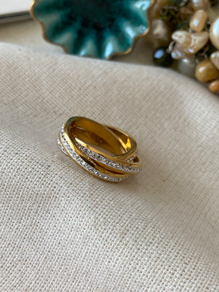 خاتم بتصميم متداخل أنيق يتألف من ثلاثة أساور رفيعة متشابكة تضفي لمسة فريدة وعصرية على الإطلالة. يأتي الخاتم باللون الذهبي اللامع مع تفاصيل مرصعة بفصوص صغيرة براقة تضيف بريقاً ملفتاً مع كل حركة. تصميم عريض نسبياً يمنح شعوراً بالفخامة والتميز مع لمسة من الأناقة الكلاسيكية. مطلي بالذهب عيار 18 مكفول سنة لتغير اللون.