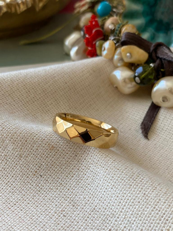خاتم ذهبي بتصميم عريض وغير منتظم، يتميز بطبقة خارجية متكسرة تعكس الضوء بشكل مميز وأنيق. يأتي بلون ذهبي لامع يضيف لمسة كلاسيكية وفخمة، مع سطحٍ مصقول يعبر عن التفرد وفي الوقت ذاته البساطة. يناسب الإطلالات اليومية والراقية على حد سواء. مطلي بالذهب عيار 18 مكفول سنة لتغير اللون.