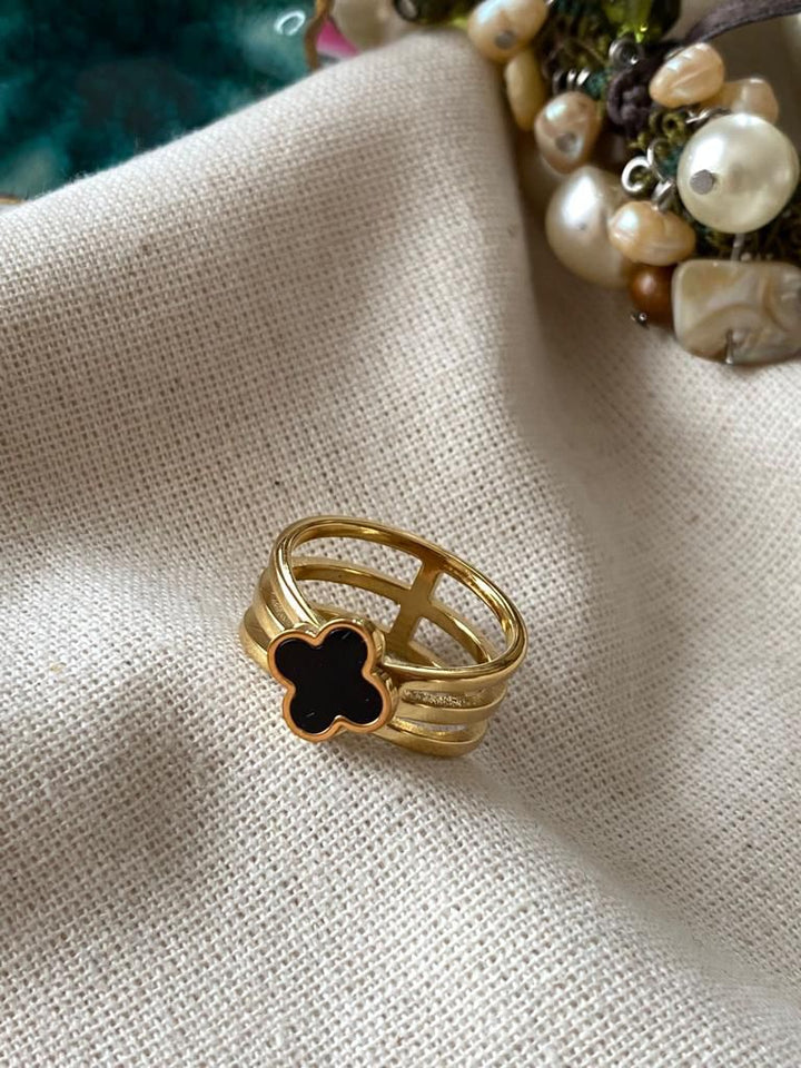 خاتم بتصميم مميز يتكون من ثلاثة أطواق ذهبية رفيعة متصلة تعطي مظهراً لعريض أنيق، يتوسط الخاتم شكل رباعي بأطراف منحنية باللون الأسود اللامع مما يضفي لمسة عصرية وجذابة. الخاتم باللون الذهبي الدافئ مع لمسات ناعمة لمزيد من الأناقة والرقي. مطلي بالذهب عيار 18 مكفول سنة لتغير اللون.