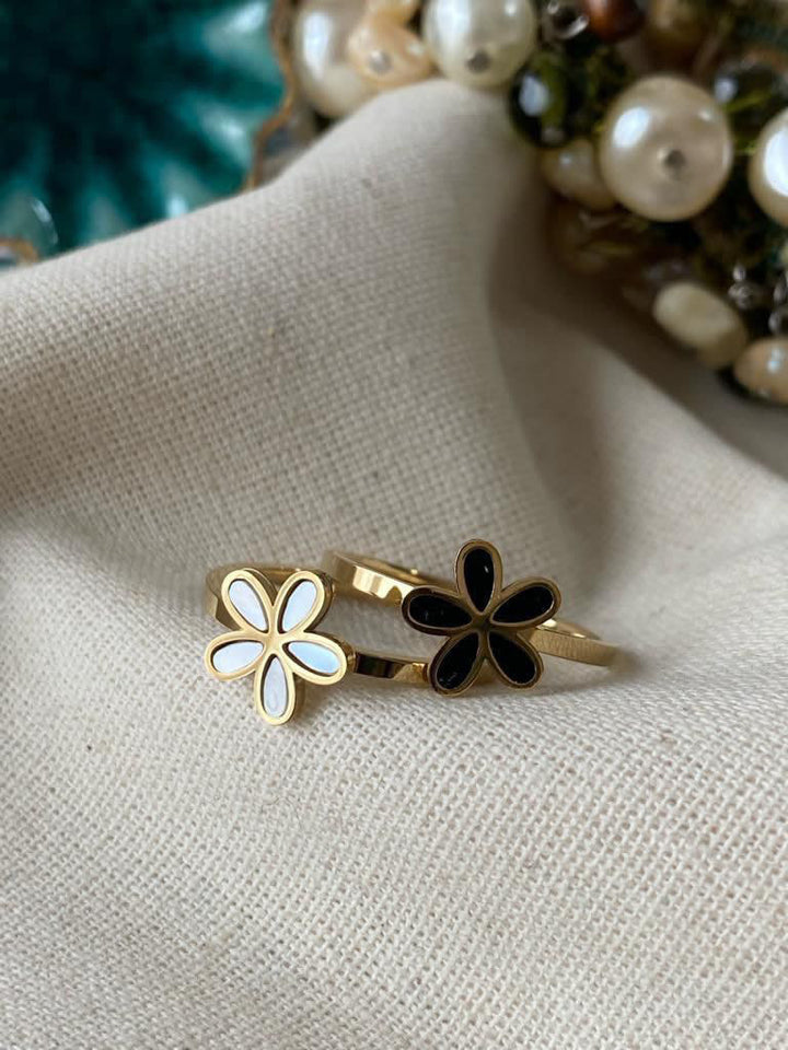 خاتم بتصميم ناعم ومميز يتكون من قطعتين متقابلتين على شكل زهرتين، إحداهما مطعمة بالمينا البيضاء، والأخرى بالمينا السوداء، مما يضفي تبايناً أنيقاً وجمالاً ملفتاً. يتميز الخاتم بحزام رفيع بسيط يعزز من تألق التفاصيل دون تعقيد، ما يجعله مناسباً للارتداء اليومي والمناسبات الخاصة على حد سواء. مطلي بالذهب عيار 18 مكفول سنة لتغير اللون.