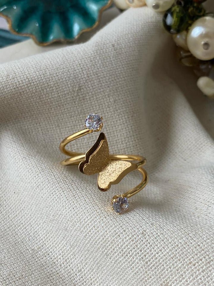 خاتم ذهبي بتصميم مفتوح أنيق يتميز بشكل فراشة مركزية ذات سطح مجعد يضفي لمسة فنية فريدة. يميل الخاتم إلى الطابع الرقيق بساعة مزدوجة تحيط بها فصوص صغيرة شفافة تضيف بريقاً ولمعاناً مميزاً. التصميم الرفيع والخفيف يجعل من الخاتم قطعة مثالية تبرز الأنوثة والنعومة. مطلي بالذهب عيار 18 مكفول سنة لتغير اللون.