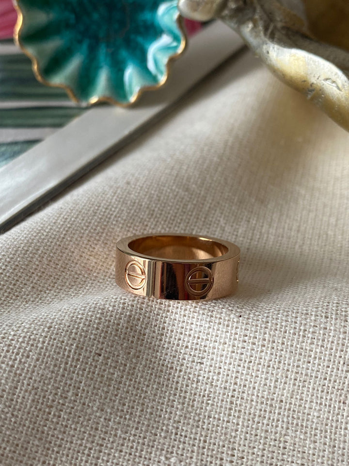 خاتم بتصميم عريض متين وبسيط، مصنوع من الذهب روز جولد بأناقة، مزين بنقوش دائرية متكررة تضفي لمسة فنية مميزة تعكس روح الفخامة والعصرية. يتميز الخاتم بسطحه اللامع الذي يعزز من تألقه ويجعله قطعة مميزة تناسب جميع الأوقات والمناسبات. مطلي بالذهب عيار 18 مكفول سنة لتغير اللون.