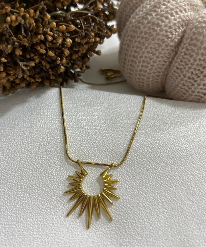 سلسلة أنيقة بتصميم قلادة على شكل أشعة الشمس تضفي لمسة مشرقة وحيوية على إطلالتك اليومية. مطلية بالذهب عيار 18 مكفولة سنة لتغير اللون.