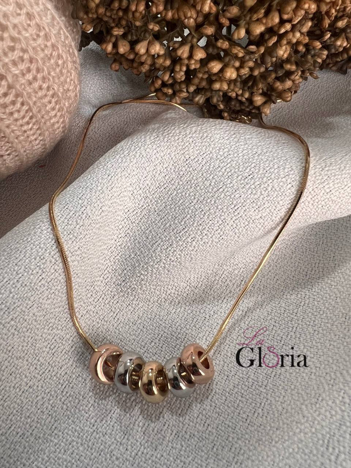 سلسلة أنيقة مزينة بحلقات ثلاثية الألوان بتناغم بين الذهبي والوردي والفضي تعبر عن الأناقة العصرية. مطلية بالذهب عيار 18 مكفولة سنة لتغير اللون.