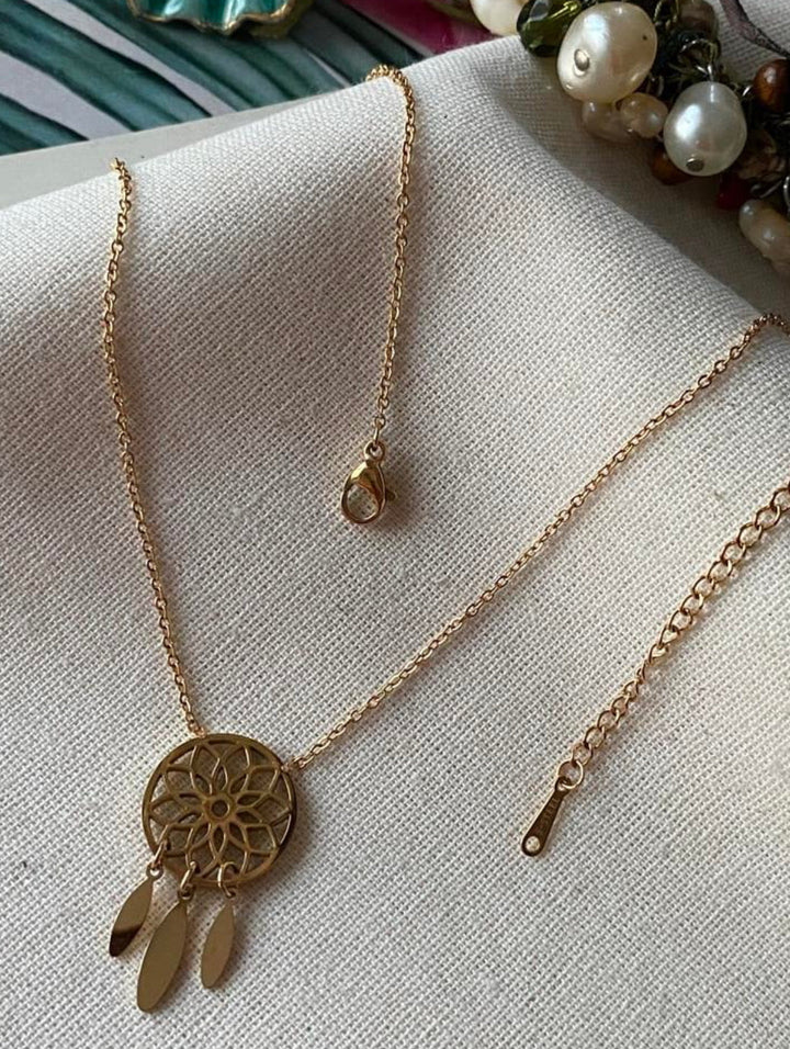 سلسلة أنيقة ذات تصميم صائد الأحلام المطرز بنقوش متداخلة وأجزاء متدلية تضفي لمسة رمزية للسحر والحماية. مطلية بالذهب عيار 18 مكفولة سنة لتغير اللون.