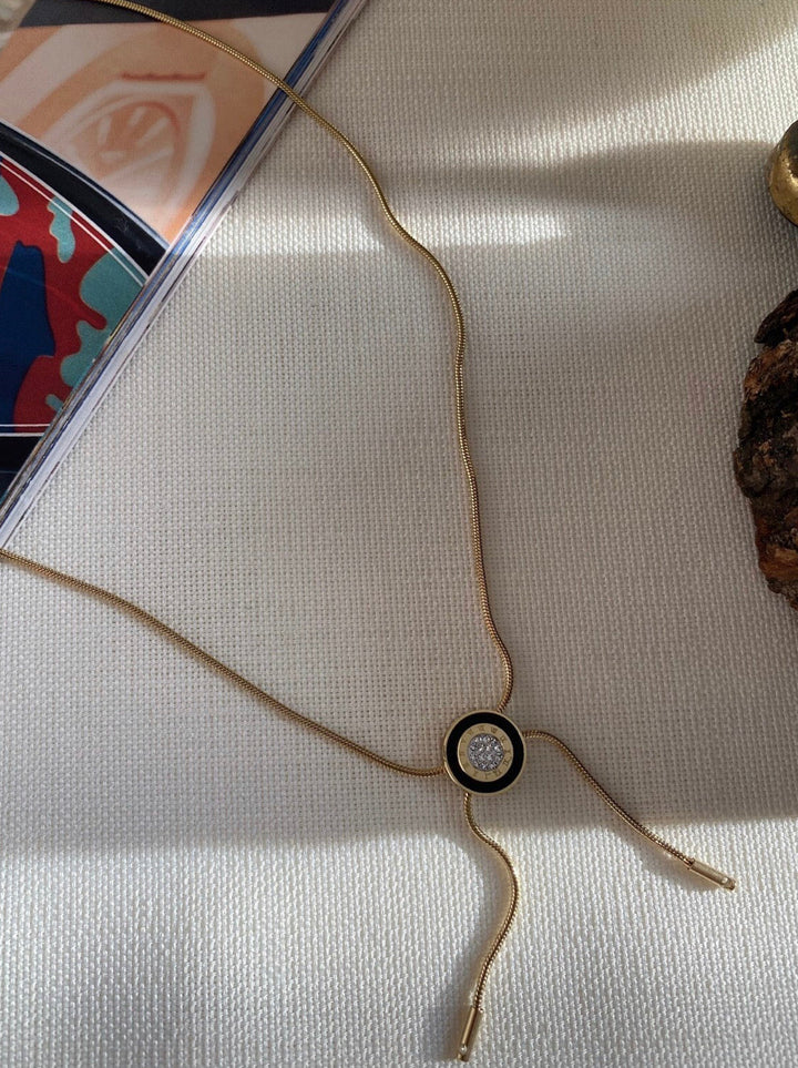 سلسلة أنيقة بتصميم رفيع مع قلادة دائرية مزينة بحلقة سوداء ونقوش مضيئة في الوسط تضفي لمسة عصرية متألقة. مطلية بالذهب عيار 18 مكفولة سنة لتغير اللون.