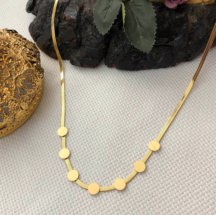 سلسلة راقية بتصميم بسيط وأنيق مزينة بعدة دوائر صغيرة متقاربة تضفي لمسة عصرية وفريدة على مظهرك. مطلية بالذهب عيار 18 مكفولة سنة لتغير اللون.