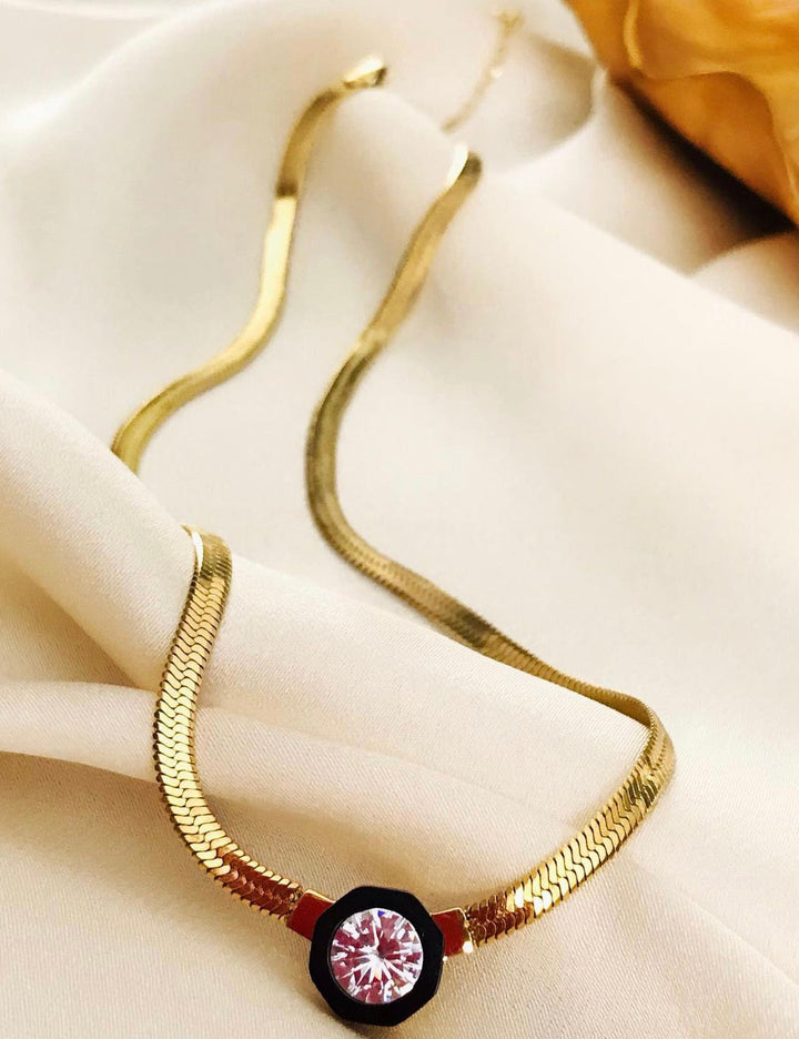 سلسلة بتصميم الثعبان الرفيع مع قلادة ماسية مركزية محاطة بإطار أسود أنيق تضفي لمسة عصرية راقية. مطلية بالذهب عيار 18 مكفولة سنة لتغير اللون.