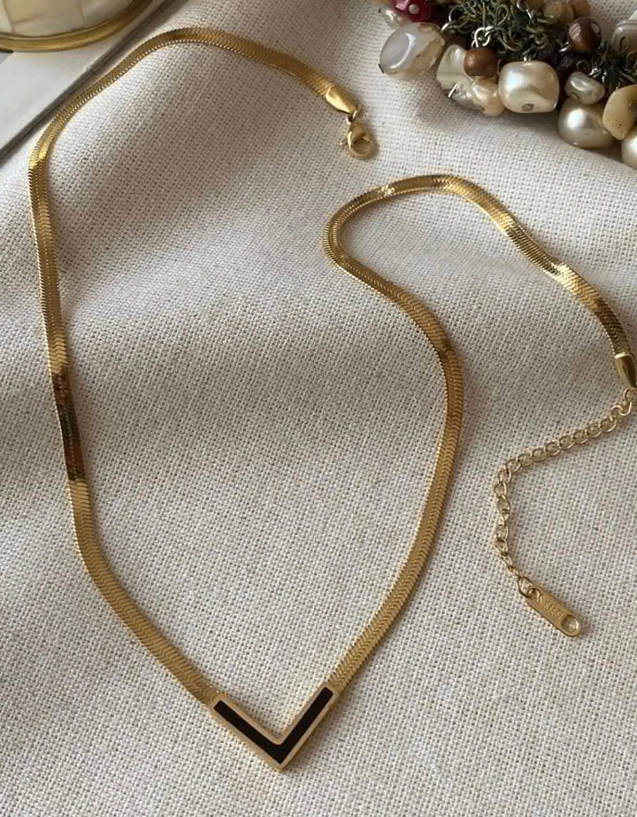 سلسلة أنيقة بتصميم سلسلة مسطحة تلمع كالذهب السائل مع قلادة على شكل حرف V باللون الأسود تضفي لمسة عصرية وجذابة. مطلية بالذهب عيار 18 مكفولة سنة لتغير اللون.