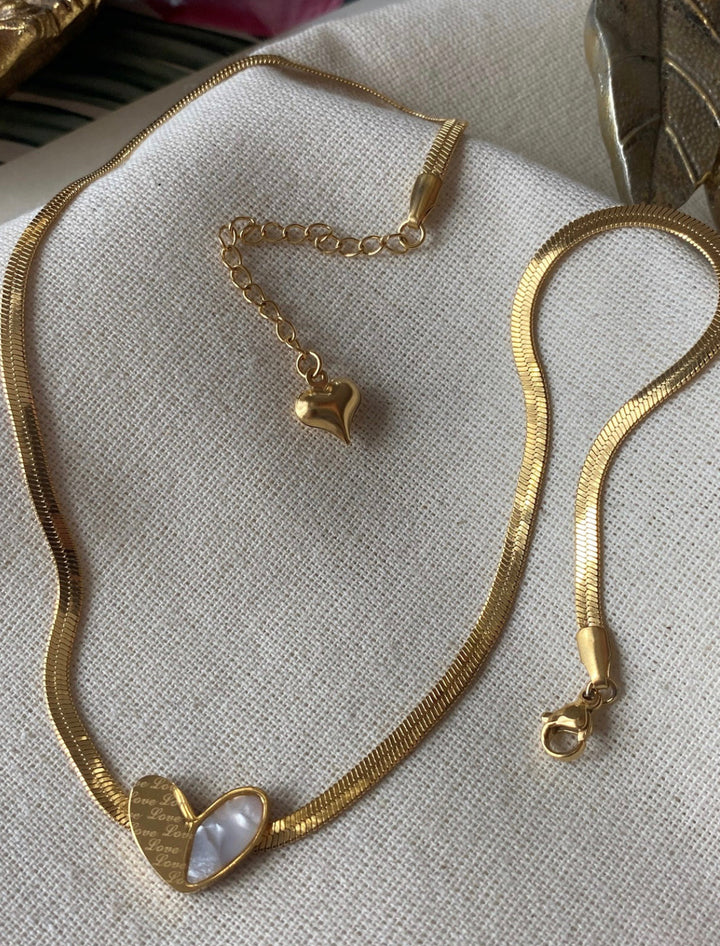 سلسلة أنيقة بتصميم قلب مزدوج نصفه مزخرف بكلمة Love والنصف الآخر مزين بلؤلؤ صناعي ناعم يضفي لمسة راقية وأنثوية. مطلية بالذهب عيار 18 مكفولة سنة لتغير اللون.