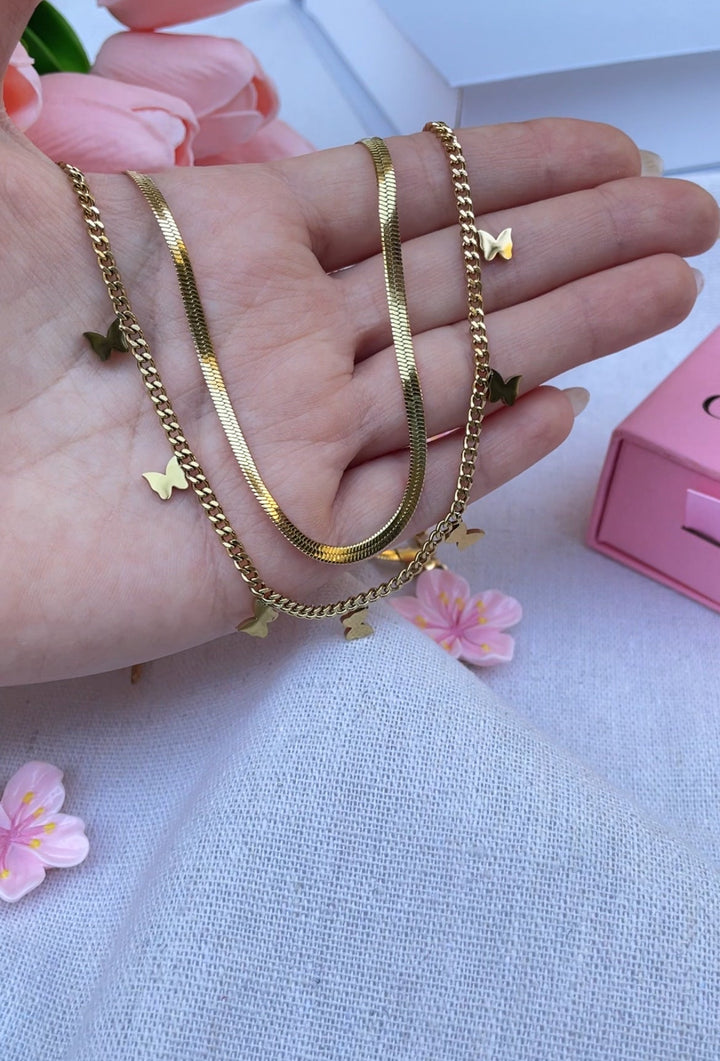 سلسلة أنيقة بتصميم مزدوج تجمع بين سلسلتين أحدهما هرمية ناعمة والأخرى مزينة بقلادات فراشات صغيرة تضفي لمسة أنثوية رقيقة. مطلية بالذهب عيار 18 مكفولة سنة لتغير اللون.