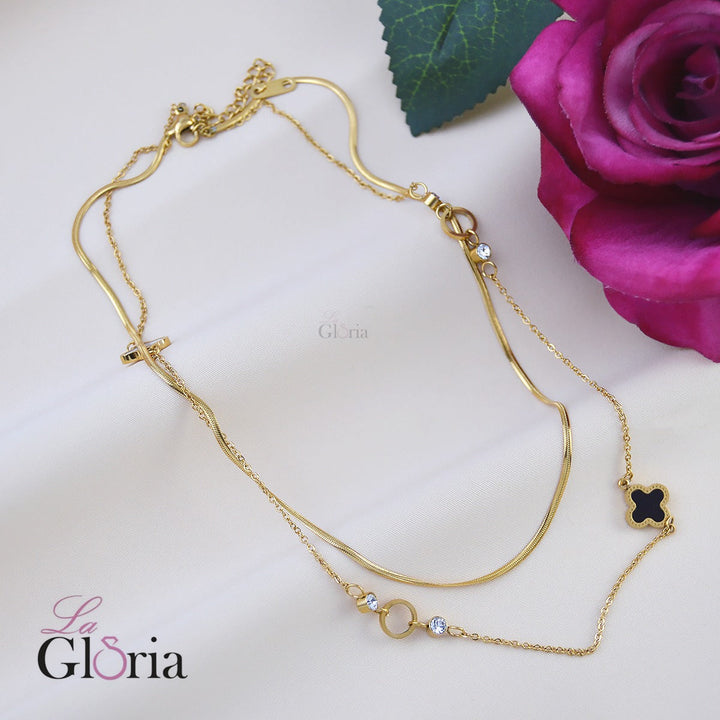 سلسلة ذهبية أنيقة بتصميم مزدوج يجمع بين سلسلة عريضة بنمط متموج وسلسلة رفيعة مزينة بأحجار لامعة وقطعة على شكل رباعي أوراق. مطلية بالذهب عيار 18 مكفولة سنة لتغير اللون.