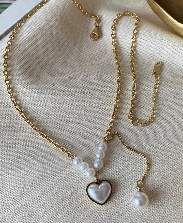 سلسلة أنيقة ذات تصميم أنيق مزينة بحبات لؤلؤ بيضاء وقلب لؤلؤي محاط بإطار ذهبي يضيف لمسة أنوثة ورقة. مطلية بالذهب عيار 18 مكفولة سنة لتغير اللون.