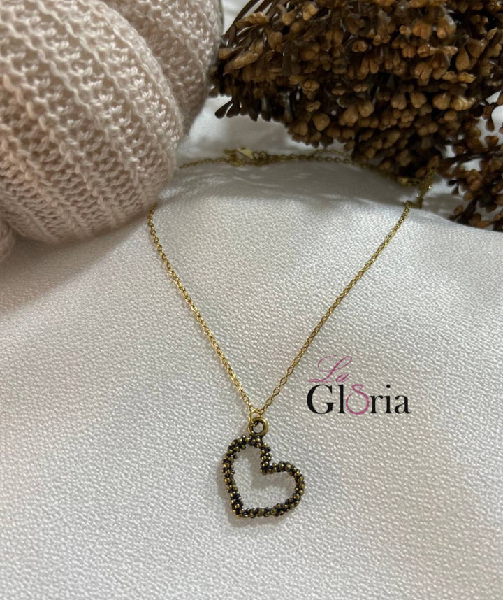 سلسلة أنيقة مزينة بقلادة على شكل قلب مرصعة بحبات ذهبية داكنة تضفي لمسة فريدة وعصرية على مظهرك. مطلية بالذهب عيار 18 مكفولة سنة لتغير اللون.