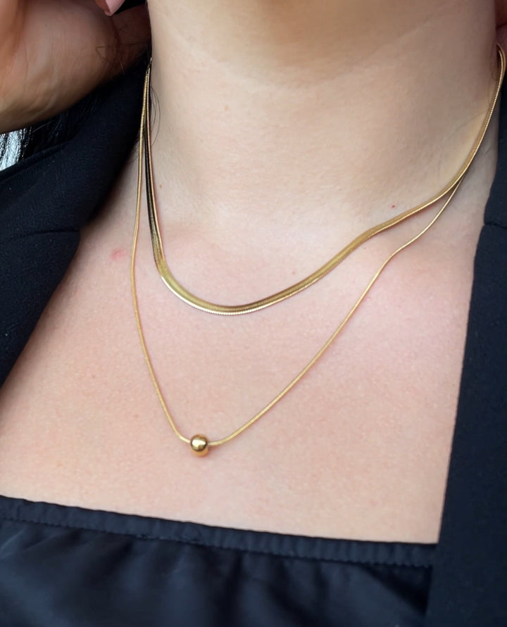 سلسلة أنيقة متعددة الطبقات تجمع بين تصاميم رفيعة وسلسلة مزينة بحبة ذهبية تضفي لمسة عصرية وناعمة على عنقك. مطلية بالذهب عيار 18 مكفولة سنة لتغير اللون.