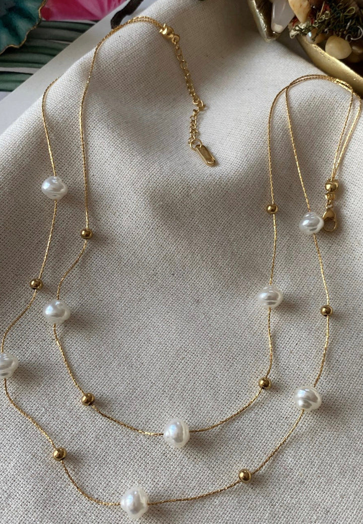 سلسلة ندى اللؤلؤ أنيقة بتصميم متعدد الطبقات مزينة بحبات لؤلؤ طبيعية متقطعة بخرز ذهبي صغير يضفي عليها لمسة راقية ورومانسية. مطلية بالذهب عيار 18 مكفولة سنة لتغير اللون.