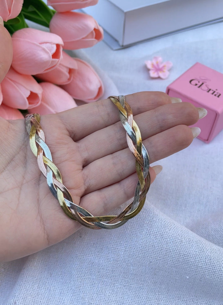 سلسلة أنيقة بتصميم ضفيرة ثلاثية الألوان تجمع بين الذهبي والفضي والنحاسي لتضفي مظهراً جذاباً ومميزاً على عنقك. مطلية بالذهب عيار 18 مكفولة سنة لتغير اللون.