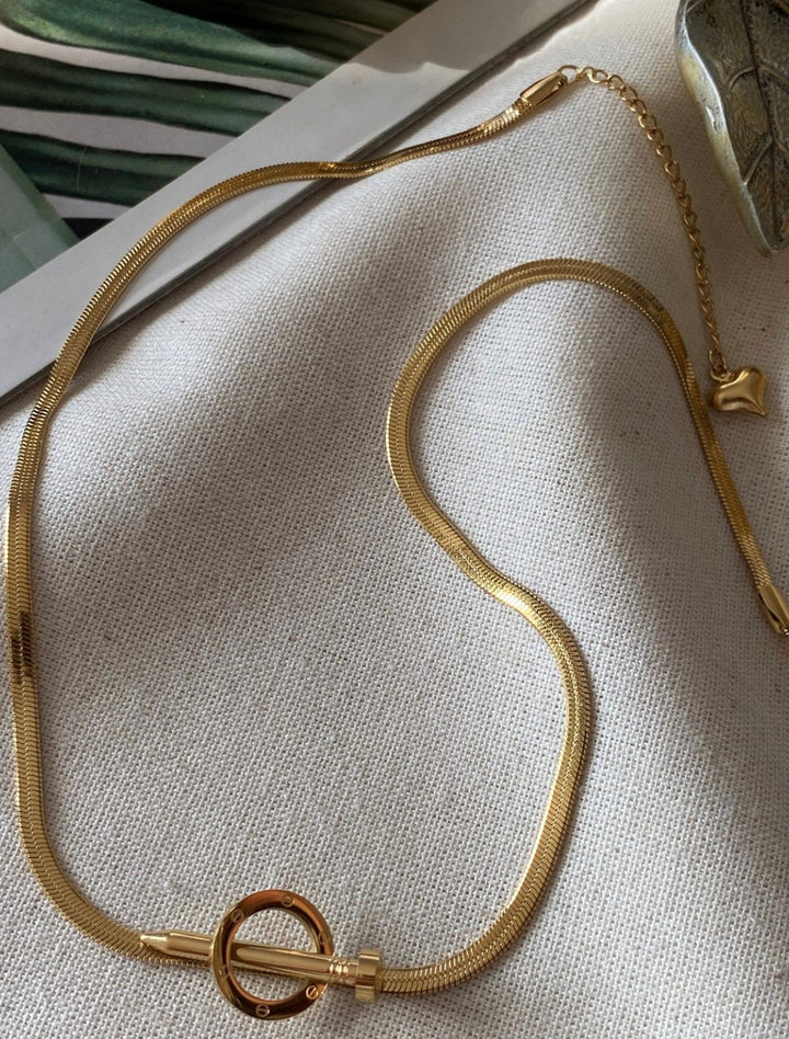 سلسلة المسمار العصري بتصميم مبتكر يجمع بين البساطة والأناقة مع قفل على شكل مسمار دائري يضفي لمسة عصرية فريدة على مظهرك. مطلية بالذهب عيار 18 مكفولة سنة لتغير اللون.