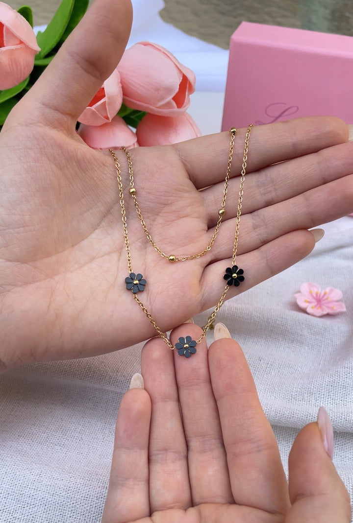 سلسلة أنيقة مزدوجة بتصميم رقيق مزينة بأزهار صغيرة سوداء تبرز جمال وعصرية الموديل. مطلية بالذهب عيار 18 مكفولة سنة لتغير اللون.