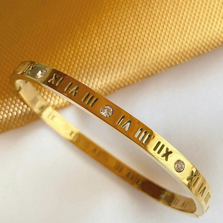سوار أنيق مطلي بالذهب مع نقوش الأرقام الرومانية وأحجار لامعة تضيف لمسة فاخرة. مطلي بالذهب عيار 18 مكفول سنة لتغير اللون.