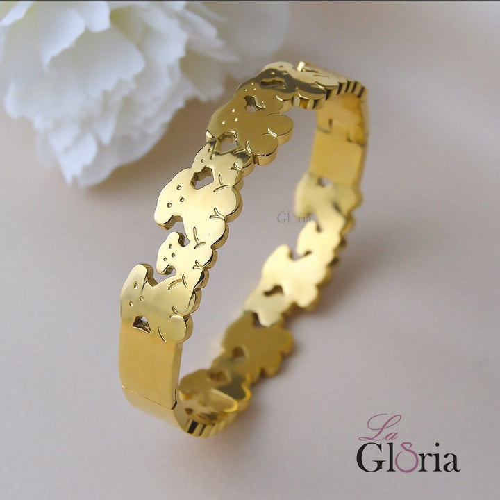 سوار أنيق مطلي بالذهب مع تصميم فراشات متصلة يضفي لمسة ناعمة وجذابة. مطلي بالذهب عيار 18 مكفول سنة لتغير اللون.