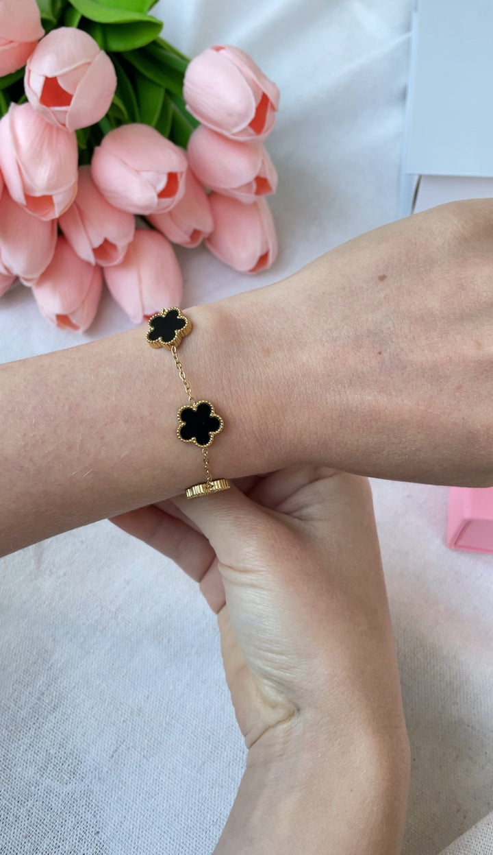 سوار أنيق مطلي بالذهب مع زهور سوداء لامعة تضيف لمسة من الفخامة والعصرية. مطلي بالذهب عيار 18 مكفول سنة لتغير اللون.