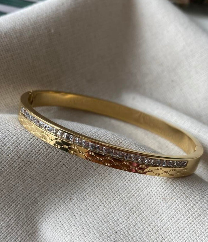 سوار أنيق مطلي بالذهب عيار 18 مع صف من الأحجار اللامعة وتصميم محفور دقيق. مطلي بالذهب عيار 18 مكفول سنة لتغير اللون.