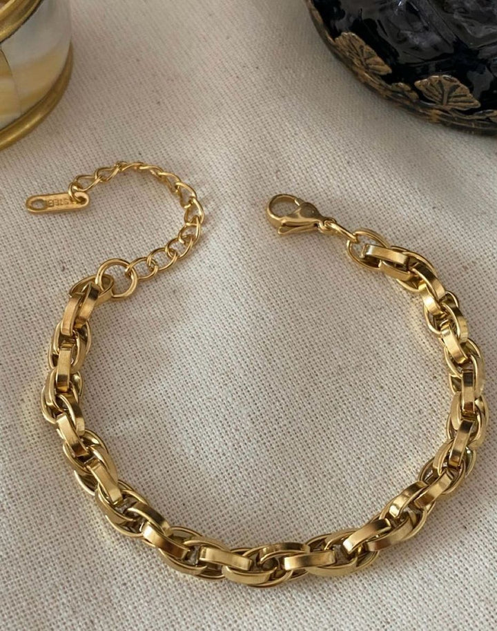 سوار أنيق بتصميم سلسلة متشابكة بلون ذهبي لامع يضفي لمسة كلاسيكية وعصرية. مطلي بالذهب عيار 18 مكفول سنة لتغير اللون.
