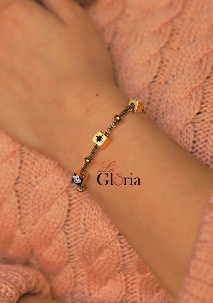 سوار أنيق مصنوع من مكعبات ذهبية مع لمسات من الأسود والأحجار اللامعة، تصميم عصري يناسب جميع المناسبات. مطلي بالذهب عيار 18 مكفول سنة لتغير اللون.
