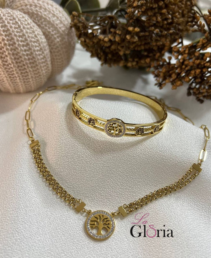طقم شجرة الحياة المميز يتألق بتناغم بين تصميمه الأنيق وتفاصيله الدقيقة التي تعكس رمز الحياة والنمو. السلسلة تأتي بتصميم مزدوج مع سلاسل رفيعة متصلة بقلادة دائرية مزينة برمز شجرة الحياة محاط بحلقات من الأحجار اللامعة تضيف لمسة براقة راقية. السوار يعكس تناسقاً مثالياً مع السلسلة، بحلقة وسطى تحمل نفس رمز شجرة الحياة محاطة بنقوش دقيقة تؤكد الأناقة والتميز. الطقم يتميز بلونه الذهبي اللامع الذي يبرز جمال التصاميم ويفضل ارتداؤه في كل المناسبات الخاصة والعادية. مطلي بالذهب عيار 18 مكفول سنة لتغير اللون.