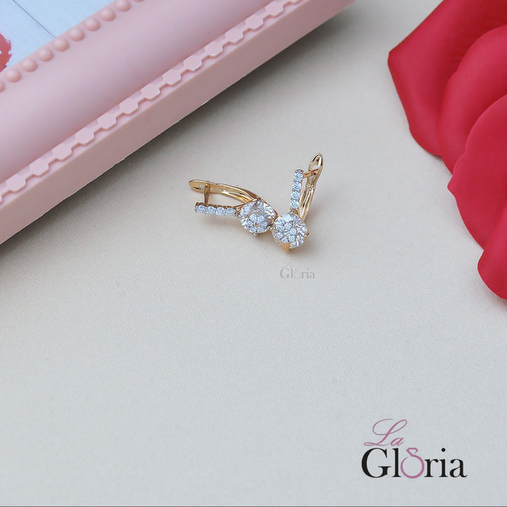 أقراط صغيرة متدلية بتصميم أنيق باللون الذهبي، مزينة بأحجار كريستالية شفافة تضفي بريقًا راقيًا. تتميز بحلق مزدوج الشريط مزين بأحجار صغيرة مع حجر مركزي أكبر يعطي لمسة فاخرة وبسيطة في نفس الوقت. مطلي بالذهب عيار 18 مكفول سنة لتغير اللون.