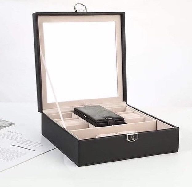 بوكس فاخر بتصميم أنيق باللون الأسود مع بطانة داخلية ناعمة باللون البيج تمنح المجوهرات حماية مثالية. يحتوي على عدة أقسام صغيرة متعددة لتنسيق وحفظ الأساور والخواتم والقلادات بشكل مرتب. مزود بمرآة داخلية على الغطاء وقفل معدني أنيق لحفظ الأمن. مصنوع من جلد صناعي متين يوفر مزيجاً مثالياً بين الفخامة والمتانة.