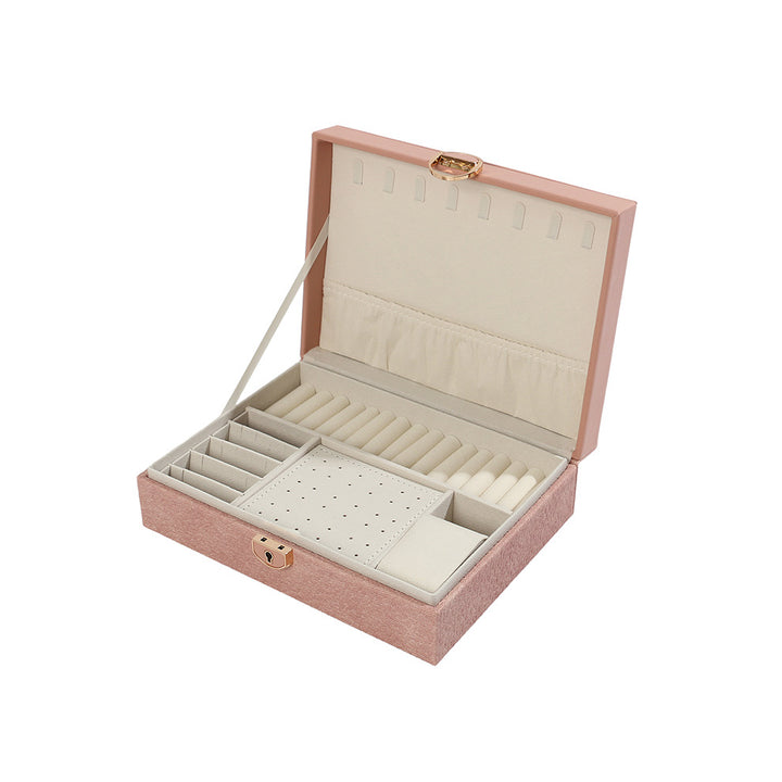 صندوق مجوهرات أنيق بتصميم زهري ناعم مصنوع من مادة مخملية فاخرة تضفي لمسة من الرقي والفخامة. يحتوي على عدة أقسام عملية تشمل درج لحفظ الخواتم مزود بأسطوانات ناعمة، وأقسام متعددة لحفظ الأقراط والقلائد بشكل منظم. مزود بقفل معدني ذهبي يضمن أمان المجوهرات، وداخل الصندوق مبطن بقماش مخملي ناعم يحمي الألوان اللامعة ويضيف إحساسًا بالرفاهية والخفة. يناسب تنظيم مختلف أنواع المجوهرات مع المحافظة على شكلها وجودتها.