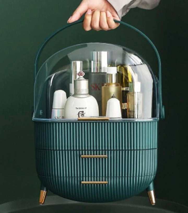 بوكس أخضر داكن مع غطاء شفاف، درجين متوسطين بأقفال ذهبية، ومقبض متين للحمل والتنقل