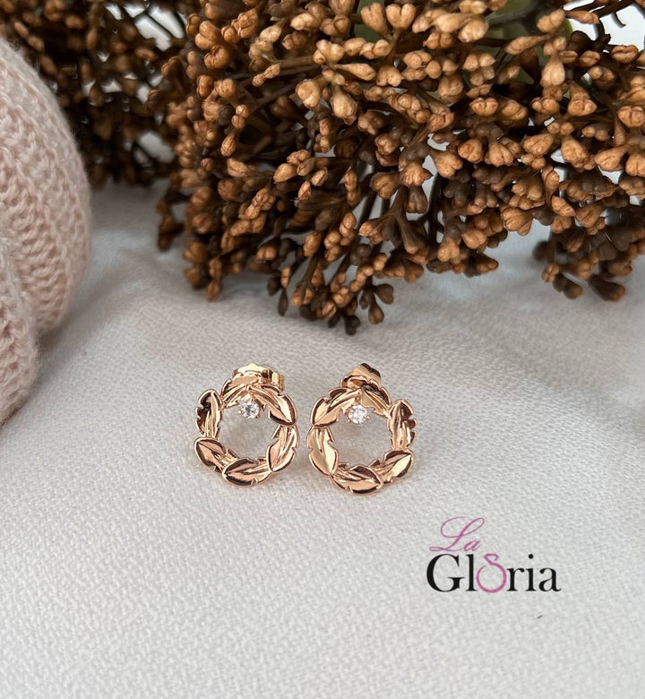 حلق صغير بتصميم إكليل من الأوراق مطلي بالذهب الوردي مع حجر صغير يضيف لمسة أنيقة وناعمة، مطلية بالذهب عيار 18 مكفولة سنة لتغير اللون