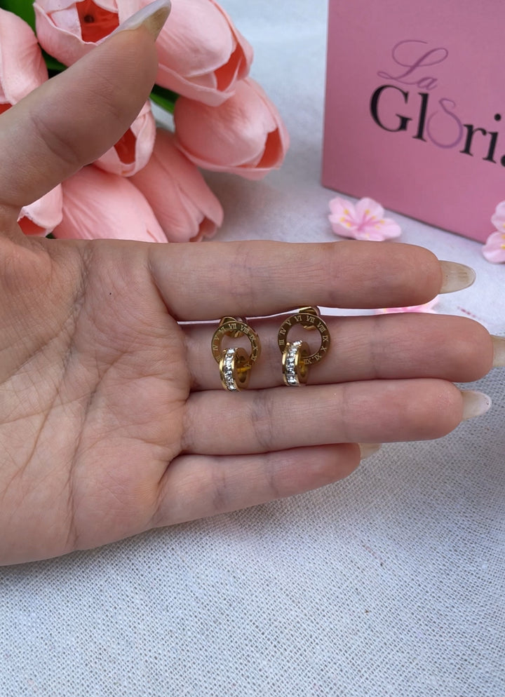حلق صغير دائري ذهبي اللون مزين بنقوش رموز أرقام رومانية تضفي لمسة عتيقة أنيقة، تزينه حلقة صغيرة أمامية مرصعة بأحجار شفافة تضيف لمعاناً راقياً ومناسباً للوك اليومي والخاص. مطلي بالذهب عيار 18 مكفول سنة لتغير اللون، مطلية بالذهب عيار 18 مكفولة سنة لتغير اللون