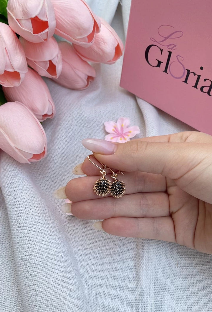 حلق صغير متدلي بتصميم دائري يشبه كرة مزينة بتفاصيل دقيقة من حبات صغيرة باللون الذهبي مع لمسات من خرز أسود مركزي يبرز تصميمه العصري والأنيق. يوحي بخامة مصقولة تعكس الأناقة والتميز في المناسبات اليومية والرسمية. مطلي بالذهب عيار 18 مكفول سنة لتغير اللون، مطلية بالذهب عيار 18 مكفولة سنة لتغير اللون