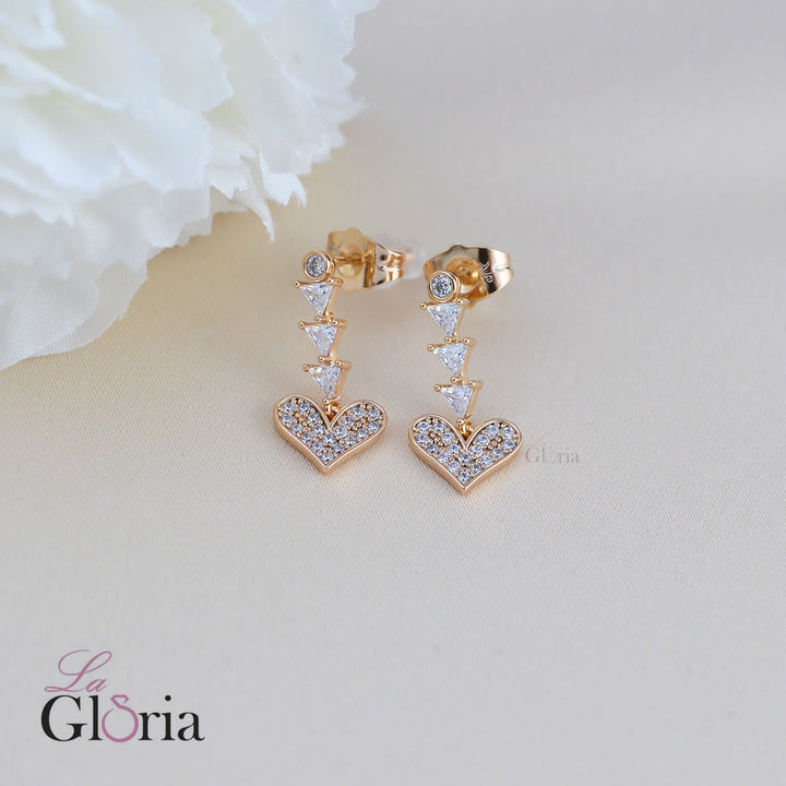 حلق متدلي صغير بتصميم جذاب من الذهب الأصفر، مزين بأحجار كريستالية شفافة تتدرج على شكل مثلثات وصولاً إلى قلب صغير مرصع بالكامل بأحجار براقة تضفي لمسة أنثوية راقية. مطلي بالذهب عيار 18 مكفول سنة لتغير اللون.